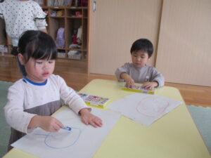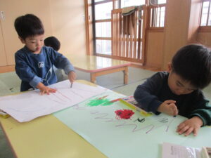 毎日、体を動かし、元気いっぱいの2歳児さくら組さんも今日は、画用紙の中で思いを表現(#^.^#)