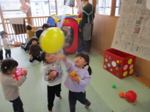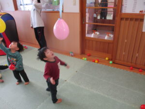 高いところの風船めがけて背伸びをし、手を伸ばしタッチしようと試行錯誤!!