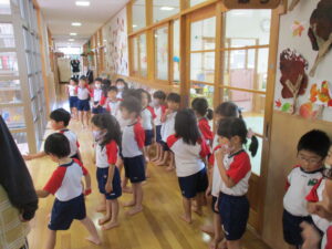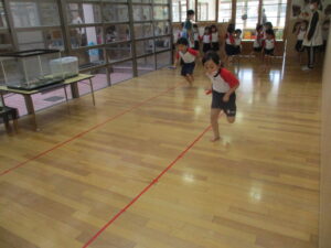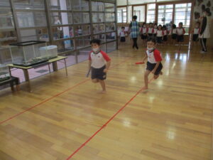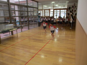 3歳児ばら組さん・4歳児きく組さん・5歳児ひまわり組さんはホールを使って赤組、青組に分かれてリレー!!