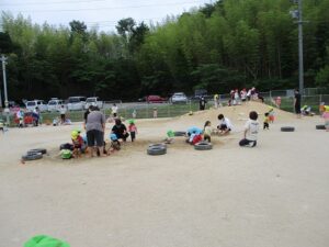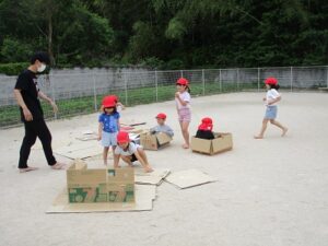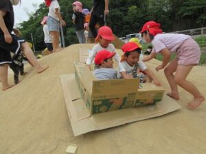 先月はみんなで遠足ごっこ、今月は、園庭に楽しいコーナーができ、みんなで遊びました。