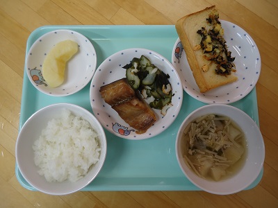 2022.06.08 6月8日(水)今日の給食 今日の給食は、 ごはん・鯖の香味焼き・きゅうりの酢の物・麩のすまし汁・りんご でした。 おやつは、のりじゃこトースト でした。 < 前の記事へ | 次の記事へ >
