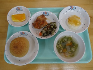 豆乳黒糖パン・チキンチャップ・きゅうりとトマトの甘酢和え・オクラスープ・オレンジ でした。