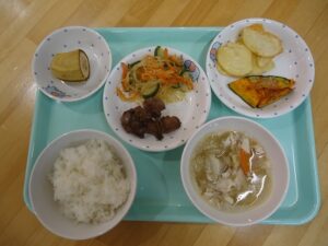 ごはん・鶏レバーの甘辛煮・春雨サラダ・豚もやしスープ・ばなな でした。