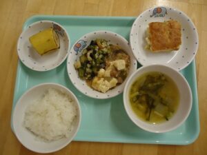 ごはん・夏野菜マーボー・オクラとちくわの海苔和え・南瓜の味噌汁・バナナ でした。
