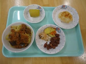 茄子のミートスパゲティ・金時豆煮・焼き野菜・バナナ でした。