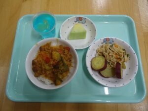 2022.08.24 8月24日(水)今日の給食 8月24日(水)今日の給食は、 夏野菜キーマカレー・切り干し大根のごま酢和え・さつま芋・メロン でした。 おやつは、『きんぎょがにげた ゼリー』でした。 < 前の記事へ | 次の記事へ >