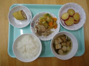 2022.08.25 8月25日(木)今日の給食 8月25日(木)今日の給食は、 ごはん・豚肉とごぼうの味噌炒め・そうめんかぼちゃの中華和え・麩のすまし汁・バナナ でした。 おやつは、さつま芋のレモン煮 でした。 < 前の記事へ | 次の記事へ >
