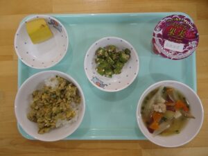 2022.08.27 8月27日(土)今日の給食 8月27日(土)今日の給食は、 納豆そぼろ丼・オクラのおかか和え・五目汁・バナナ でした。 おやつは、ぶどうゼリー でした。 < 前の記事へ | 次の記事へ >
