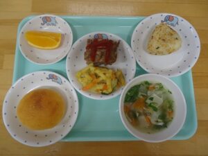豆乳にんじんパン・ハンバーグ・カレーマカロニサラダ・かぶのスープ・オレンジ でした。