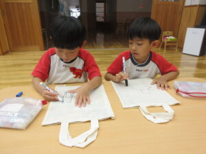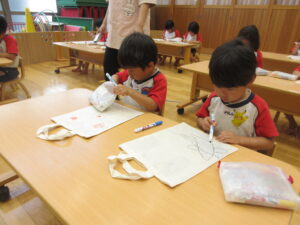 布バッグにマジックで絵を描いて、世界に一つだけのマイバッグを作りました。