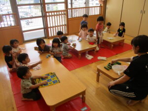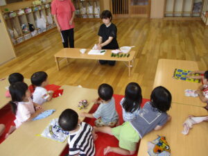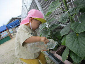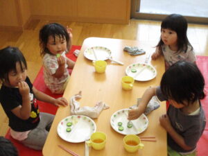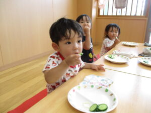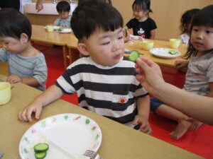 2024.06.12 キュウリ🥒ができたよ☆さくら組 プランターで育てたミニキュウリ。今日8本収穫しました。先生が包丁で切ってマヨネーズをつけてパクッ(^^♪ お花が咲いたよ お水をあげたよ 先生が包丁で切っています。真剣に見てますね。 早く食べたいな ちょっぴり苦手だけど食べてみよう う~ん、みずみずしい!! おいしいね~!! また食べようね~ < 前の記事へ | 次の記事へ >