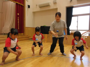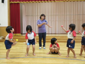 「けんだましょ~うぶ」(けん玉勝負)みんなでいろいろな技を挑戦しています。