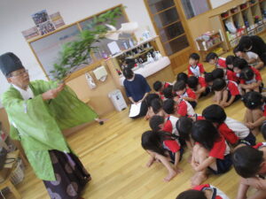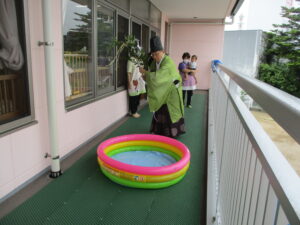 乳児部さんのプールもおはらいしていただきました。お部屋から乳児部の子どもたちは興味深そうに見ていましたよ(^^)