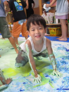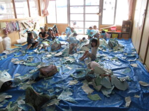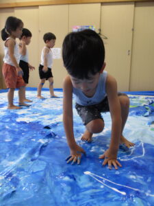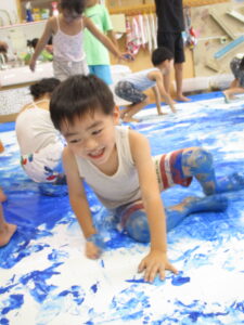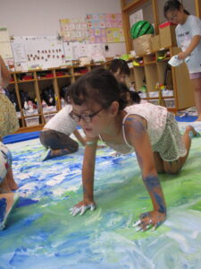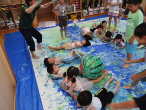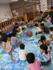 お部屋いっぱいに紙を敷き詰めて絵の具を流して…(学童の子どもたちに手伝ってもらいました)