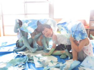 もうこの時には絵の具は乾き、紙はビリビリに破れていました。「ちぎって~波だ~!!」