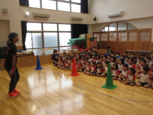 ばら組、きく組、ひまわり組、学童キッズさんは遊戯室に集合。ジロー先輩のパフォーマンスにくぎ付けでした。