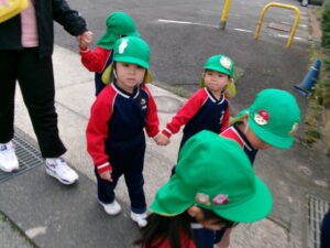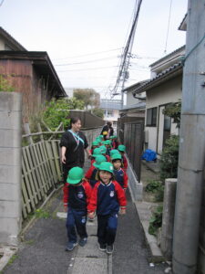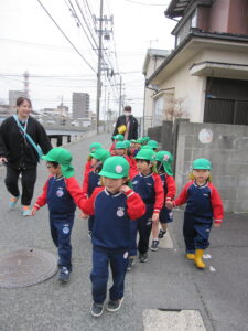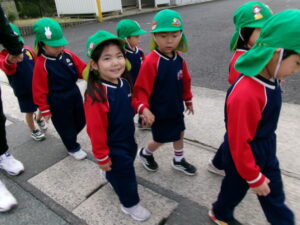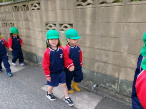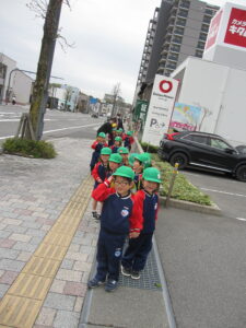 きく組になって初めてのお散歩。園の周りをぐるっと歩きました。歩くうちに上手に歩けるようになりました。