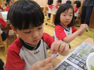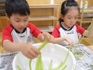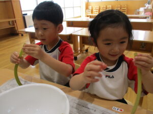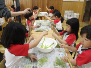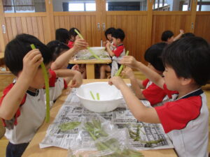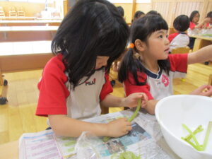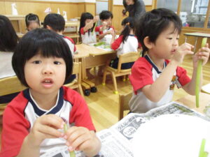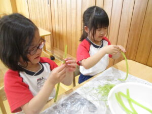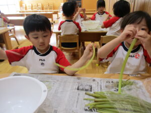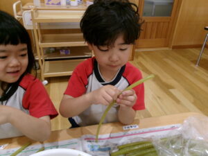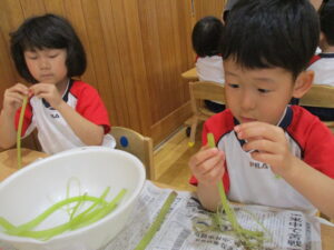 フキのスジ取りに挑戦するひまわり組の子どもたちです💚