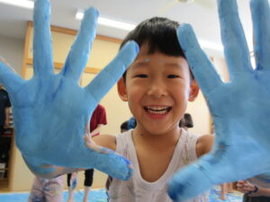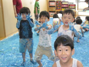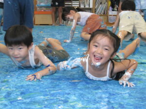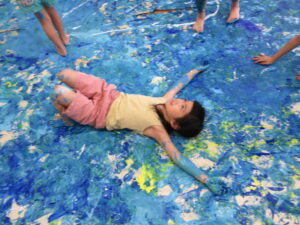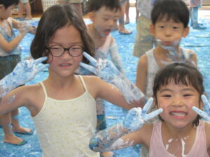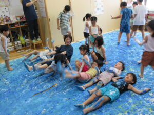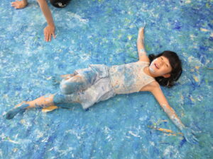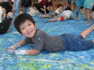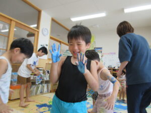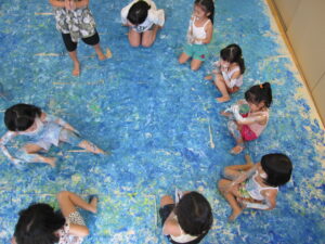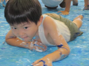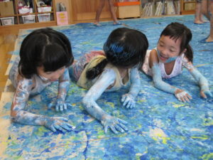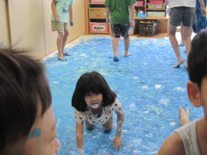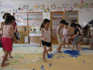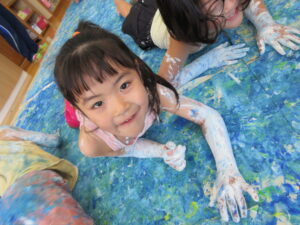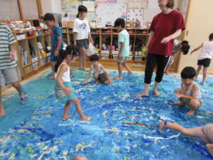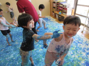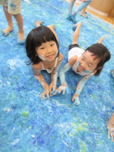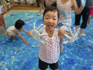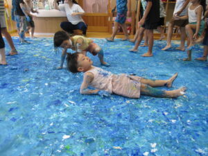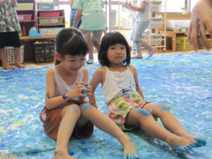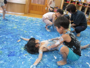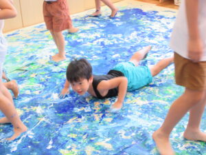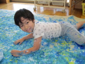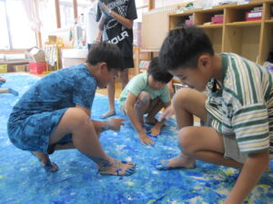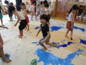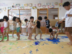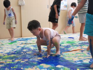 キッズさん(学童)に絵の具を垂らしてもらって、キャーキャー。足で絵の具をのばしていました。