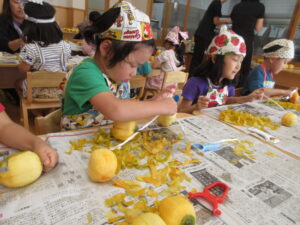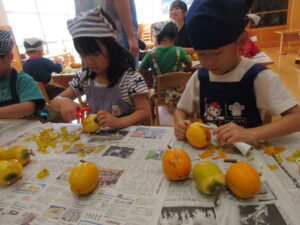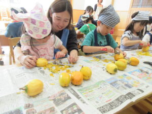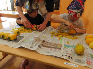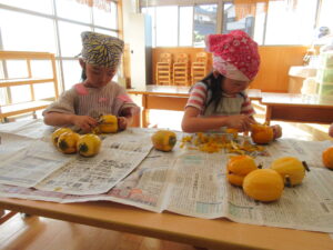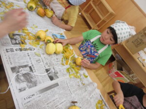 ピーラーで柿の皮むきをしました。指に気を付けながらしましたよ。