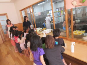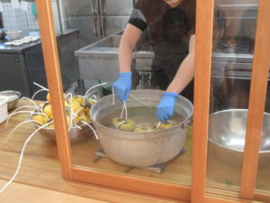 給食の先生がお鍋でお湯をわかして・・・熱いお湯に柿を10秒!!みんなで数えました。熱湯消毒です。