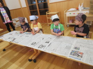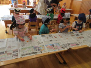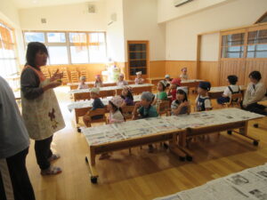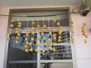 熱湯消毒した後にひまわり組のテラスへ柿を干しましたよ。