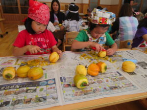 渋柿をちょっとだけ食べてみました。顔をゆがめる子どもたち。