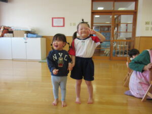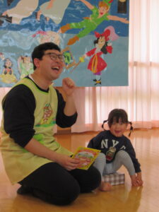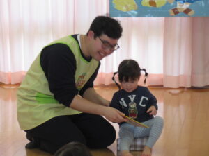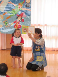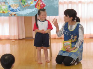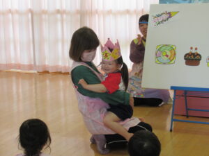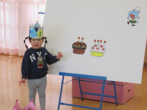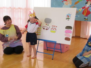 先生からの出し物の時間!お誕生日の子どもたちのケーキを作りましたよ♡「わたしは、いちごのケーキだよ♡」