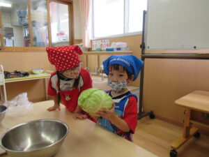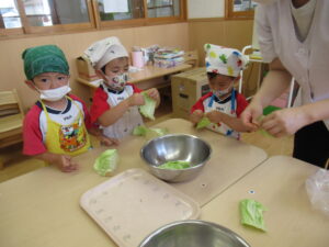 まるごとのキャベツを一人ずつさわったり、持ったりしてみると「おもたいねー!」「つめたいよ」という言葉がきかれました。生なので、結構かたい葉をちぎるのに真剣な表情でした。