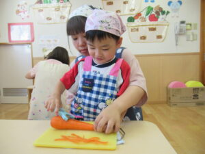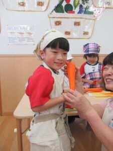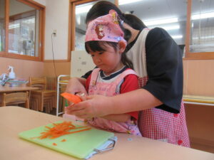 先生と一緒に、にんじんをピーラーでむくことに挑戦しました。