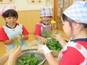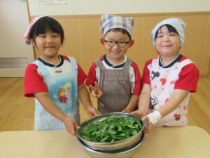 モロヘイヤちぎりをしました。たくさん葉っぱがあり一枚ずつとるのに一生懸命でしたよ♩
