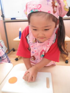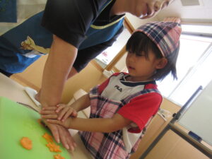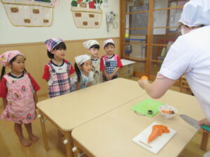 今日のお手伝いは人参の型抜き!まずは、給食先生が目の前で人参を切って見せてくれたよ♡