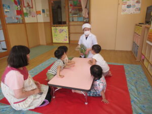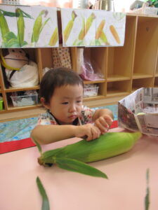 「給食先生が持っているものはなに~?」 「とうもろこしっていうんだって!」