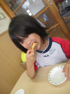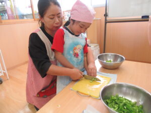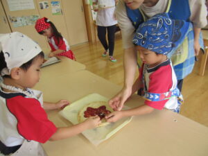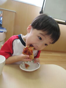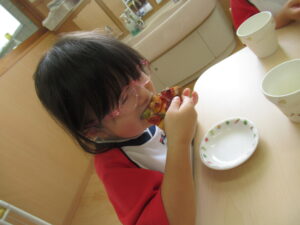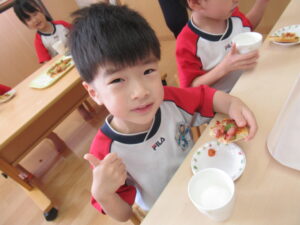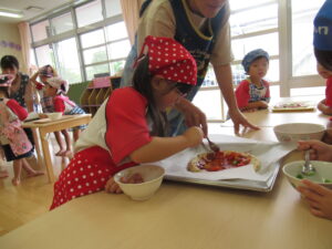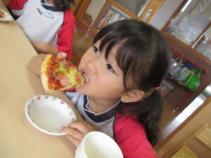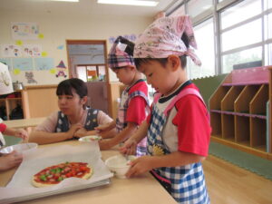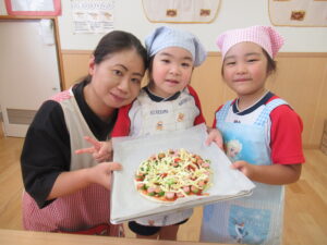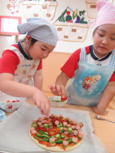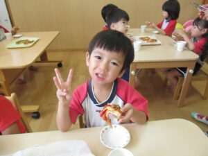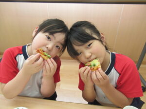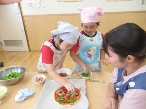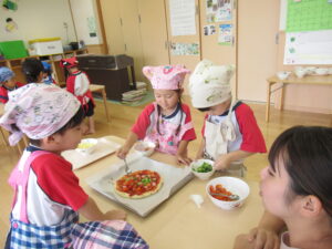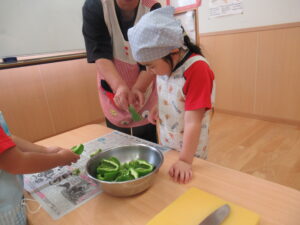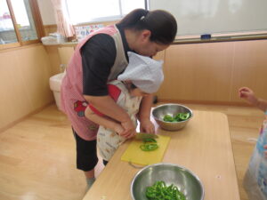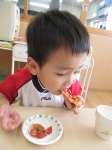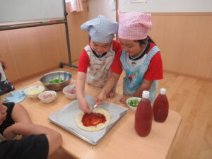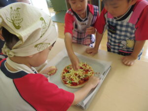 畑で収穫した野菜(ミニトマト、オクラ、ピーマン)を使用して、ぱんだ組さんがピザを作りました✨就前さんは、ピーマンとオクラを切ることにも挑戦しましたよ🎵畑の野菜は、収穫したときに炒めて食べたり和え物にして食べたりしていました!今回はみんなが大好きな”ピザ🍕”ということで、とっても楽しみにしていました🎵