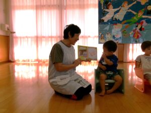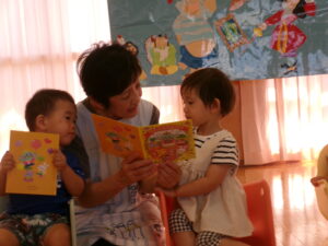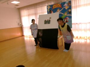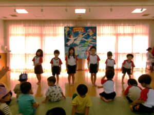 先生からの出し物は『おばけマンション』のパネルシアターでした👻✨次々と出てくるおばけにドキドキしながらも嬉しそうな子どもたち😊声を出したり、指差ししたりして楽しむ姿がありました💕