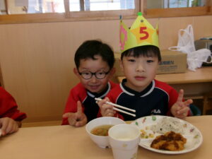 2025.11.26 11月誕生日会👑✨ 11月の誕生日会がありました🎂💕 こんなに大きくなったよ~!! おいわいのかんむり ありがとう👑 『5』がひかってるね~✨ きく、ひまわりさんのおいわいのうた🎵「かめのおさんぽ」ありがとう💕 「うさぎとかめ」のおはなしみたよ!カメさんみたいにがんばるよ~💪 ハイちーず✌✨ たんじょうびメニューのチキンカツ💕とってもおいしかったよ~😊✨ < 前の記事へ | 次の記事へ >