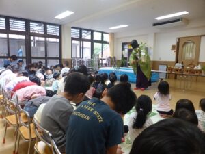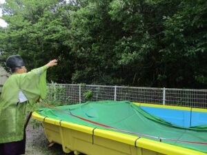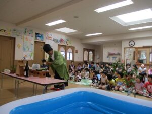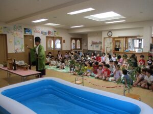 賣豆紀神社の神主さんにお越しいただき、プール開きをしました。今年も、みんなが元気で安全にプール遊びを楽しめるよう、神様言葉に変えてお願いしていただきました。みんながクラスで育てた、トマトやズッキーニを収穫してお供えしましたよ。「みんなが明るく元気に水遊びができるようにお祈りしたよ!」という神主さんからのお話しを、よーく聞いていたみんなでした。