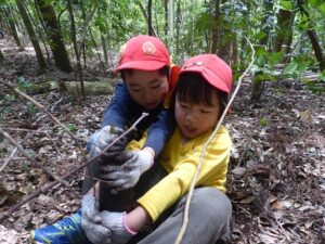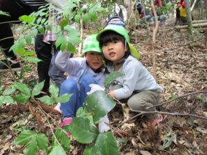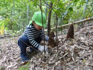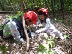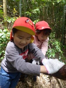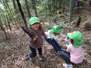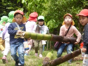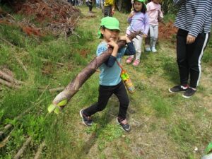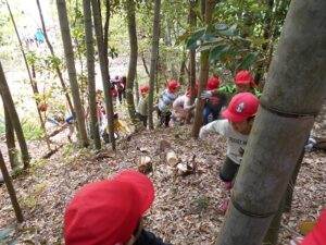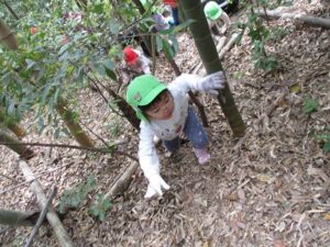 近隣にお住いの方に声を掛けていただき、たけのこ山に行きました!全身を使って山に登っていくみんな。「よしっ!みんなで登ろう!」「滑るからここにつかまって!」「たけのこあったよ~!」「こっちも手伝って~!」「一緒にたけのこ持って降りよう!」山にみんなの楽しそうな声が響いていましたよ。自然の中で、子どもたちののびのびした姿を沢山見ることができました。「もう一回行きたいな~!」と大満足のみんなでした。みんなでとったたけのこで、まだまだ遊びは続きます!