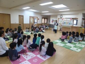 今日は、うさぎ組さんが進級してから、初めて4クラス揃って会をしました。進級したみんなの表情からは、ドキドキとわくわくが伝わってきましたよ。クラスの垣根を越えて、縦割りグループを作り、いろいろな行事で一緒にお散歩に行ったり、遊んだりして異年齢交流を楽しみたいと思います。