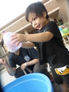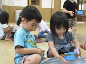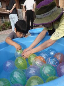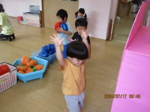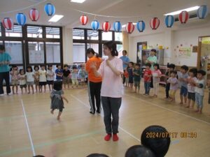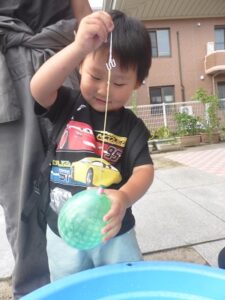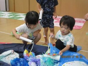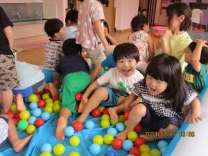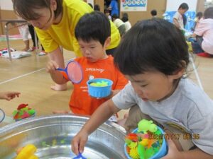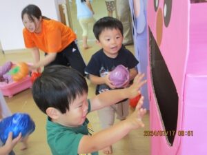 昨日、こあら・うさぎ組さんの夏まつりをしました。みんなで盆踊りを踊った後は、お楽しみのコーナー遊びへ!魚釣りコーナー、すくいどりコーナー、ボールコーナーを、自由にまわって遊びました。先日あった、ぞう・きりん組さんのお祭りの時とは、コーナーの内容を少し変えて、2歳から3歳児のお友だちでも楽しめるようにしました。どのコーナーも大賑わい!!店番の先生たちは、大喜びでした(*^^*)それぐらい、みんながじっくり楽しめていたんですよね♪これからも、子どもたちが自分で試してやってみたくなるような遊びを、作っていきたいと思います。そして、“みてみて~!出来たよ!嬉しかったよ!”という気持ちを、友だちや先生と共有できる場面に沢山出会えるといいなと思っています。