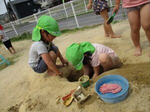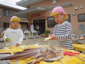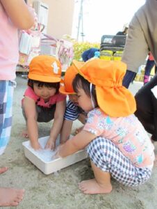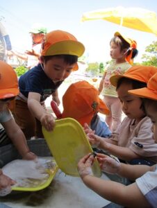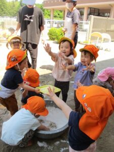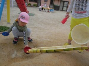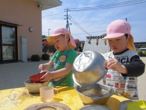 5月は外遊びにいい季節!みんなが大好きな外でたくさん遊べました。園庭でも、泥や砂、水、泡の感触が味わえるコーナーがいっぱい!「明日もやりた~い!」と、ますます外で遊ぶのが好きになったみんなでした。