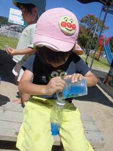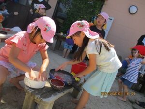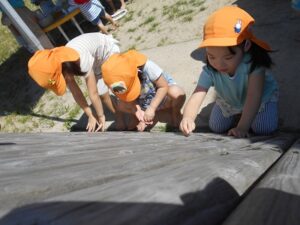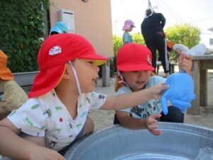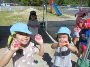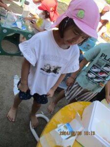氷でこんなに夢中になって遊べる子どもたちってすごいですよね♪氷が水に変わっていく性質を利用して、子どもたちが考えたり試したりできるような遊びがどの年齢でも見られました。また、異年齢で遊ぶことで、お互いの遊ぶ姿をよく観察して、自分も真似してみようという場面も沢山見られましたよ。暑い夏だからこそできる氷まつり!また、五感を使った遊びを楽しもうね♪
