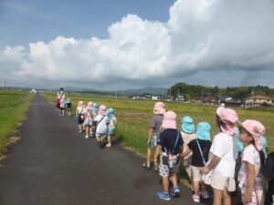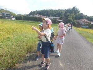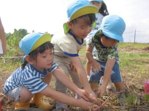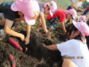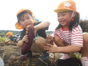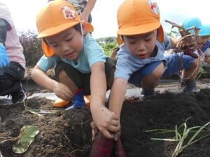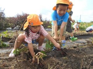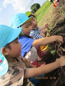 10/1(火)、いよいよみのり畑のサツマイモが収穫の時期を迎えました。『おっきいサツマイモいるかな~?』と、畑に行く道中もワクワクが止まらない子どもたちでしたよ。最初は恐る恐る掘っていくと、『あったー!!』とあっちからもこっちからも声が上がり、土の中にどっしりと座っているサツマイモを何とかして掘ろうと夢中になるみんなでした。一人の力で掘れない時は、友だちや先生の力を借りてパワーアップし、ツルを引っ張ったり、どんどん掘り進めたりしていきました。すると、『とれたー!!』と歓声が\(^o^)/汗だくになって大きなサツマイモを見せてくれる子どもたちの表情は最高でした!!