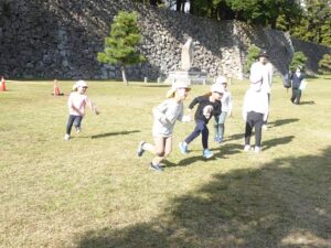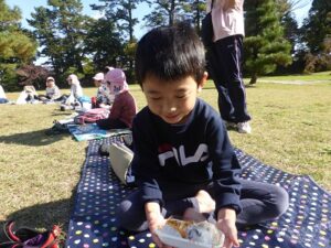 県庁前でバスを降り、いざ城山へ!多くの観光客の皆さんと一緒に、松江城を目指しました。急な石段もへっちゃら!松江城を間近で見た時は、「お~~っ!!!」と歓声があがっていましたよ。松江城の周りを散策し、どんぐりや松ぼっくり、小枝や赤や黄色の落ち葉を沢山拾うことが出来ました。沢山歩いて広い芝生エリアに到着。後から届けてもらった給食のお弁当をモリモリ食べてから、鬼ごっこをしたり、地域の方たちに声を掛けてもらいふれあったりと、楽しい時間を過ごしました。