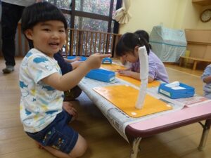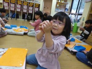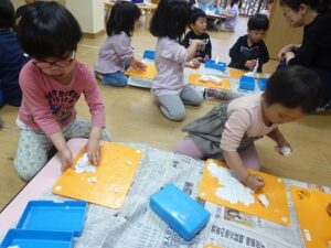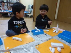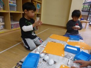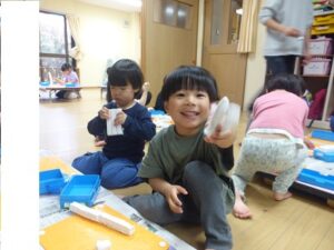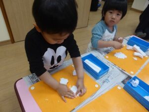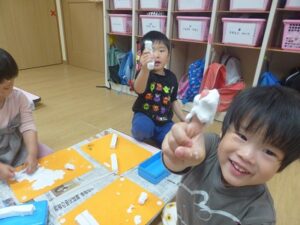 こあら組さんは、新しい粘土を自分で袋から出して遊んでいましたよ。ちぎったり、丸めたり、伸ばしたり、指先をしっかり使って遊ぶみんなでした。