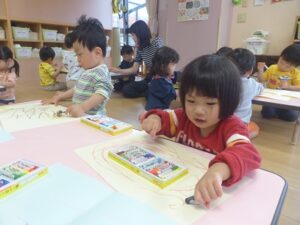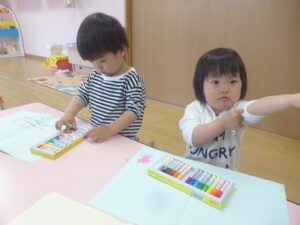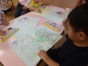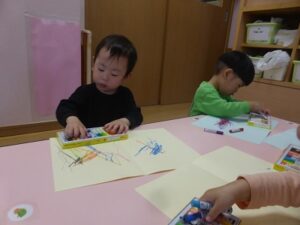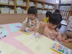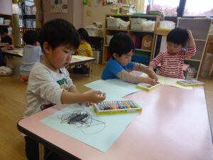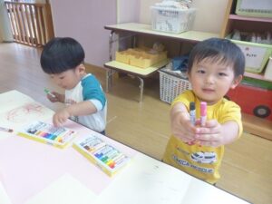 うさぎ組さんも、初めてクレパスを使って遊びましたよ。新しいクレパス、とっても嬉しいよね。『♪どんないろ~がすき?』と、歌いながら描いている子もいましたよ。自分の粘土もクレパスも宝物!大切に使って、これからもいっぱい遊ぼうね!
