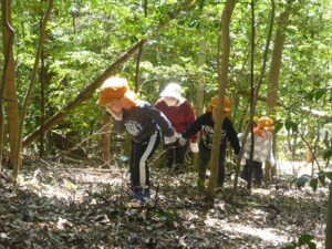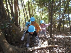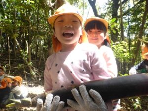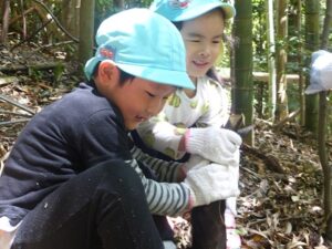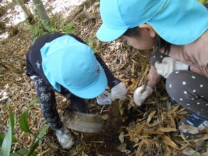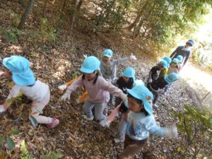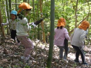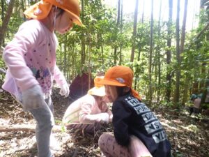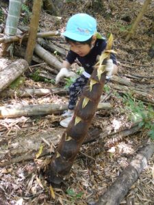 今日は、地域の方にお声を掛けていただき、たけのこの山に遊びに行きました。ぞう組さんは二回目、きりん組さんは初めての挑戦でした。葉っぱで滑りながらも、全身を使って自然の中を駆け巡る子どもたち!何度も何度も登ったり下りたりしながら、たけのこを探していました。たけのこを見つけると、「どうやって取る?」「一緒に取ろう!」と子どもたち同士で考えたり、試したりする姿がありましたよ。いつもとは違う環境の中で、夢中になって遊ぶ子どもたちの表情はとても生き生きとしていました。取ったたけのこを保育園に持って帰り、まだまだ遊びは続きます!