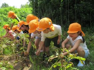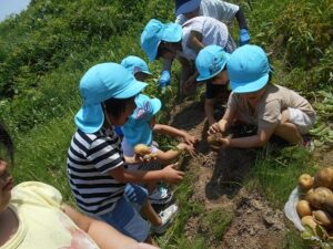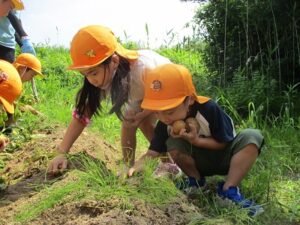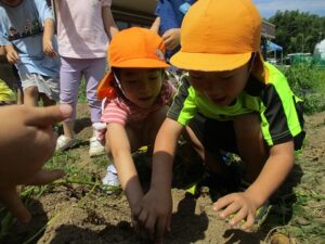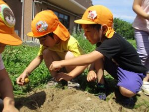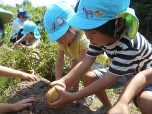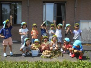 ぞう組さんときりん組さんが、春に植えたじゃがいもの収穫をしました。この暑さでどんどん生長していったじゃがいも・・気付けば葉っぱに元気がなくなっていました。でも、それが収穫のサイン!いざ掘ってみると、次から次へと、いろいろな大きさや形のじゃがいもが出て来て大喜びのみんなでした。宝探しみたいだったね!掘ったじゃがいもは、またクッキングしてみんなで食べる予定です。「フライドポテトがいい!!」「カレーライス!!」と大盛り上がりでしたよ。(*^^*)