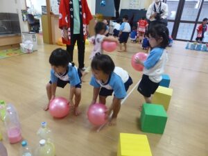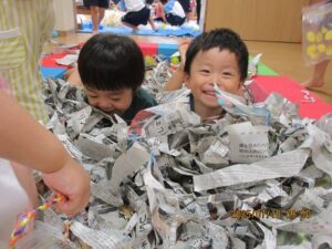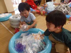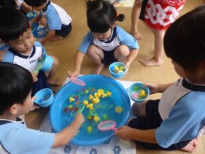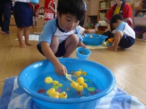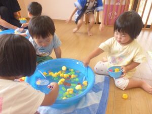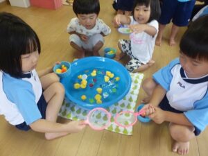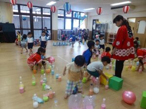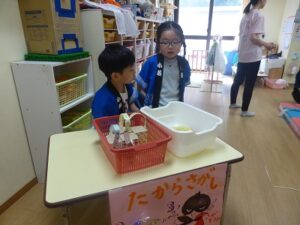 今日は、こあら・うさぎ組さんの夏まつりがありました。今日の遊びのコーナーは、すくいどり、ボーリング、宝探し!子どもたちの年齢に合わせ、昨日と少し変えて楽しみました♪そして、コーナーの店番を手伝ってくれたのはぞう組さん!「いらっしゃいませ~!」と張り切って店番をしてくれました。どのコーナーも大賑わい!じっくりそのコーナーの遊びを楽しむ子、いろいろなコーナーを自由に行き来して遊ぶ子、嬉しそうな姿が沢山見られましたよ。今年も、子どもたちの笑顔いっぱいの夏まつりになりました♪