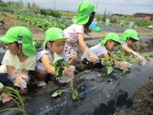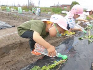 - 優しく苗を持って植えてくれました。どこにさつまいもができるのかなぁ?
